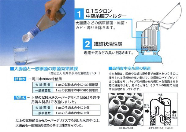 ○使用できる水 ・水道水、地下水、井戸水・魚などの生物が生息している谷川・河川水・湖沼水・ポリタンクなどの溜め水、入浴剤などが入っていない風呂水、トイレのタンクの水・プールの水、雪解け水、雨水など ×使用できない水 ・魚などの生物が生息していない谷川、河川水、湖沼水・生活排水、工場排水、農薬、除草剤などが流れ込んでいる恐れのある河川水、湖沼水・毒劇物、有機溶剤、有害重金属などが溶け込んでいる恐れのある水・その他、海水、ウイルスなどの有害物質を含む恐れのある水 病原細菌<大腸菌(O−157など)、コレラ菌、赤痢菌やサルモネラ菌など>カビや原生動物(エキノコックスなど)で汚れた水や濁り水も安心して飲めるキレイな水に変える携帯用浄水器。